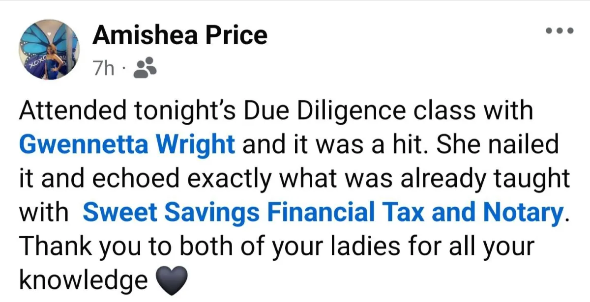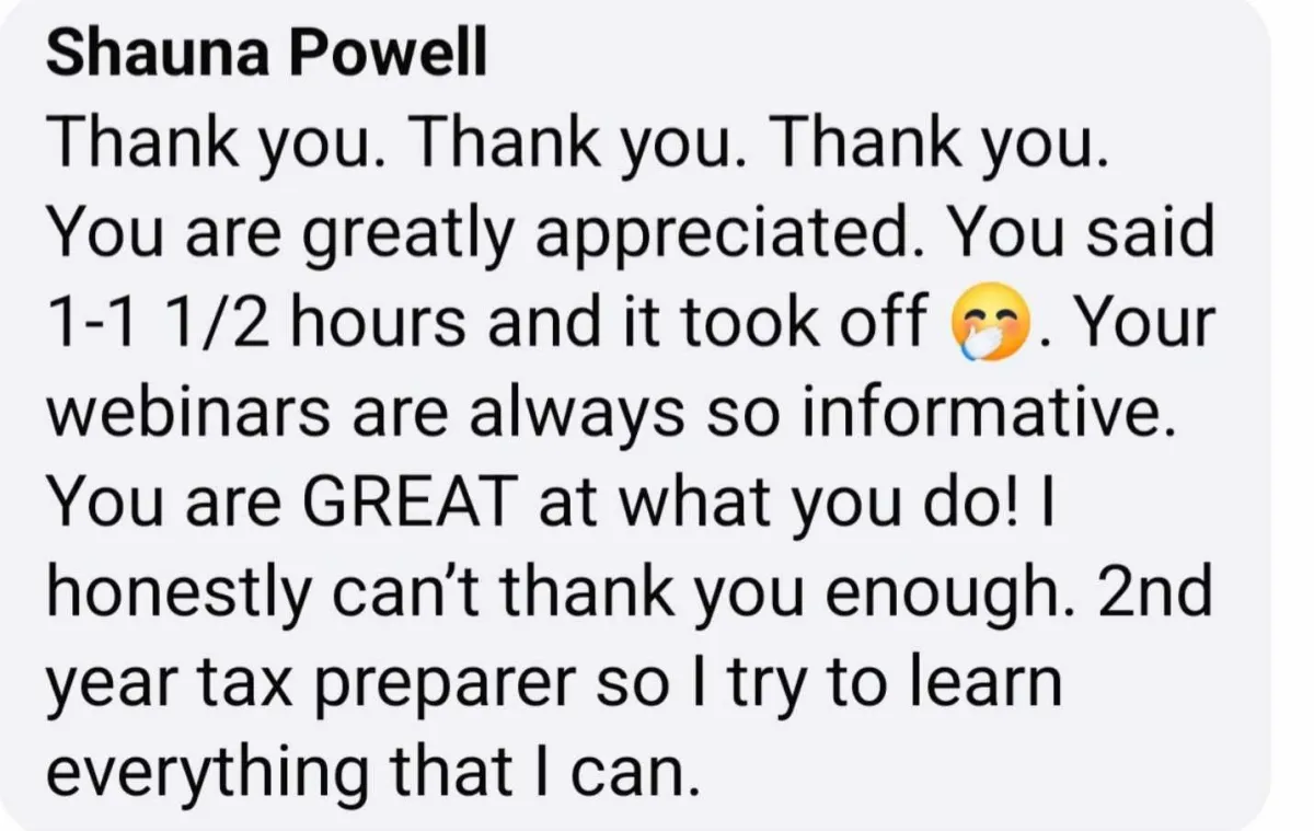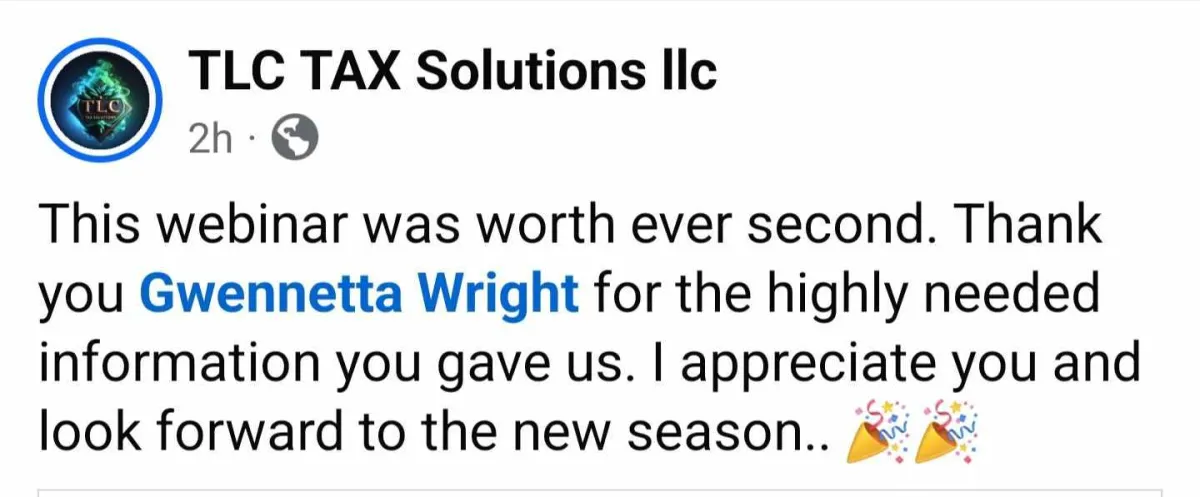 "Dr. Gwennetta helped shift my mindset around IRS audits, empowering me to know the law, protect myself, and stay compliant. I truly appreciate the clarity and confidence this class gave me, and if you’re in the tax industry, you absolutely need to be here." - CJ