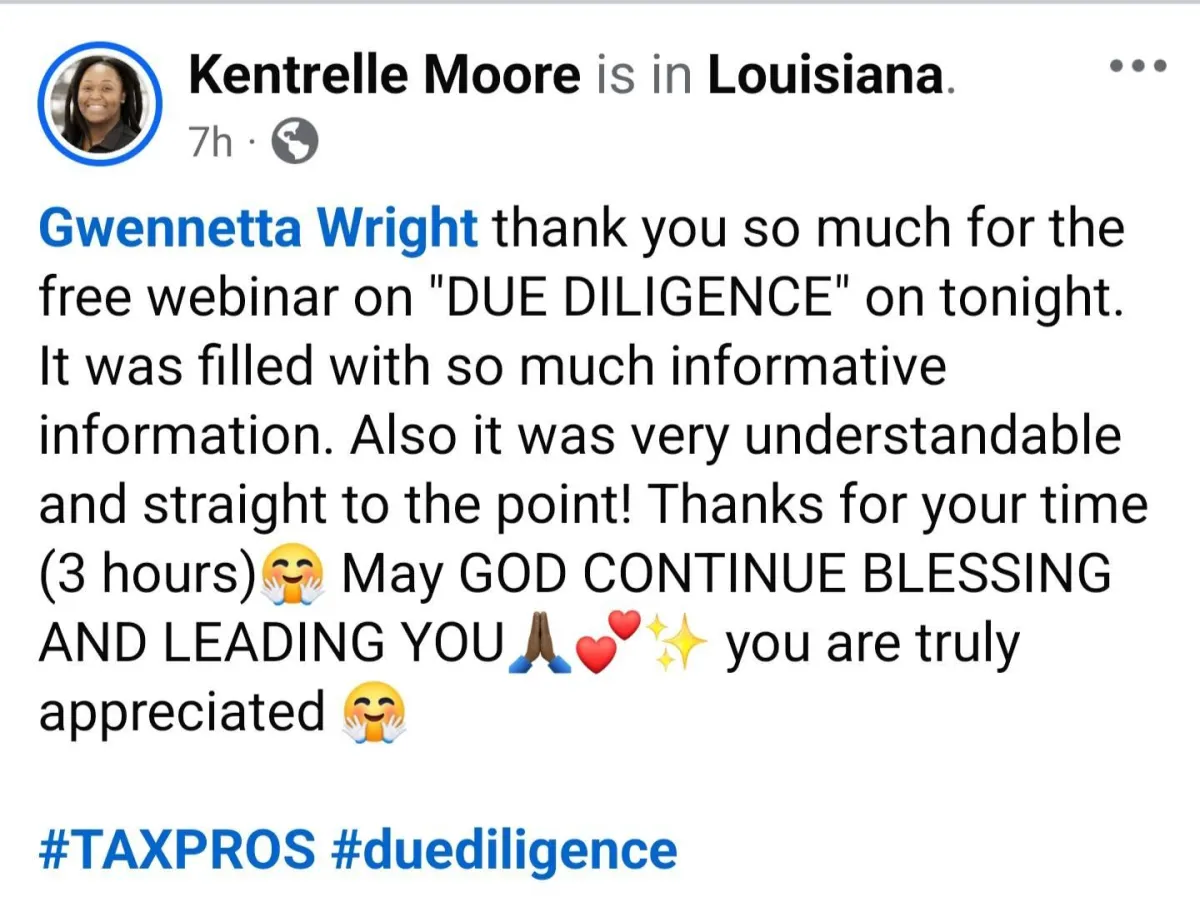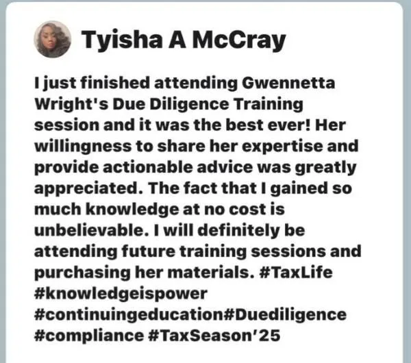 If you're a tax professional, you should definitely consider joining the Gwennetta Wright group. It's a fantastic resource where you can keep learning-she is always sharing new insights and teaching something valuable. Remember, due diligence audits are not to be taken lightly, and I've learned so much from her. Stay open-minded: while you can learn from anyone, it's important to learn from the right person.